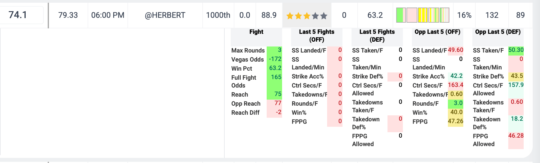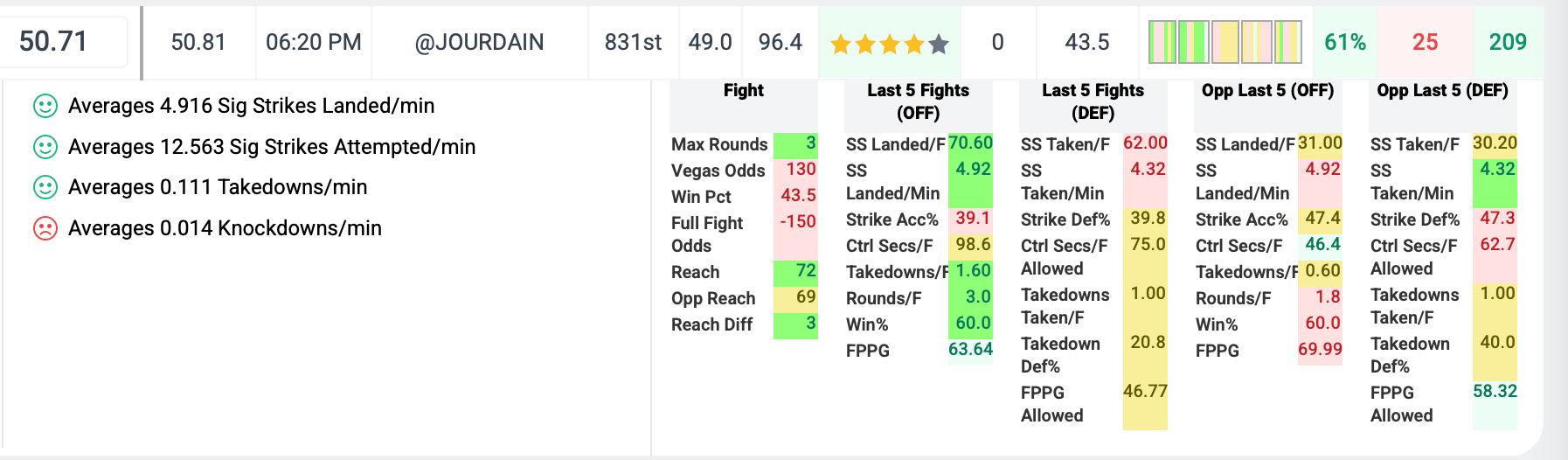 Kyler Phillips ($7.5k): This guy is good. Really good. But he has a major malfunction: His gas tank. For one round, Phillips is one of the best bantamweights in the world. They donāt call him āThe Matrixā for nothing. At least for one round, Kyler is The One like Neo. He combines an unrelenting pace with an extensive arsenal of weapons on his feet. He can kickboxing straight up, or he can bust out the fancy shit and start spinning and throwing flying shit at you. And when you think you've got him figured out, he level changes and puts you on your back. Skill for skill, attribute for attribute, he is better than Charles Jourdain. But Phillips lacks the dog that Jourdain has. Phillips has to score an early finish or win the first two rounds. In noine UFC bouts, Iām not sure Phillips has won a third round. Phillips averages five SLpM with a career high of 114 significant strikes landed against Pedro Munhoz.