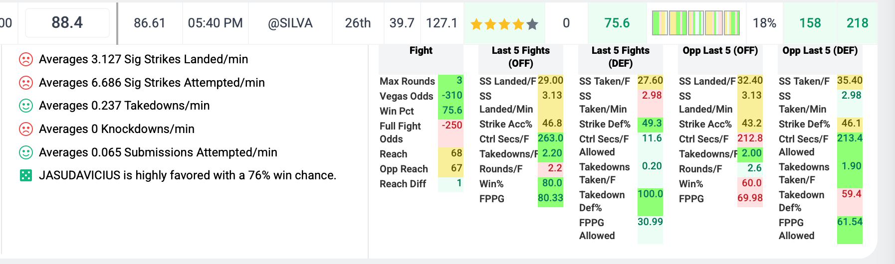 Jasudavicius will be the (-300) favorite, and Silva will be the (+250) live-ish dog. If she can buy time on her feet, Karine will dominate the stand-up. The odds would be reversed if this were a kickboxing match. Fantasy-wise, Silva will be a dud. She averages only 2.5 SLpM and will likely spend long stretches on her back. Jasudavicius will quietly rack up takedowns and top control, but donāt expect a finish. The play for this one is a decision. Itās hard to make a case for a 21% takedown defense against a takedown machine. Jasmine Jasudavicius via decision. On wax.