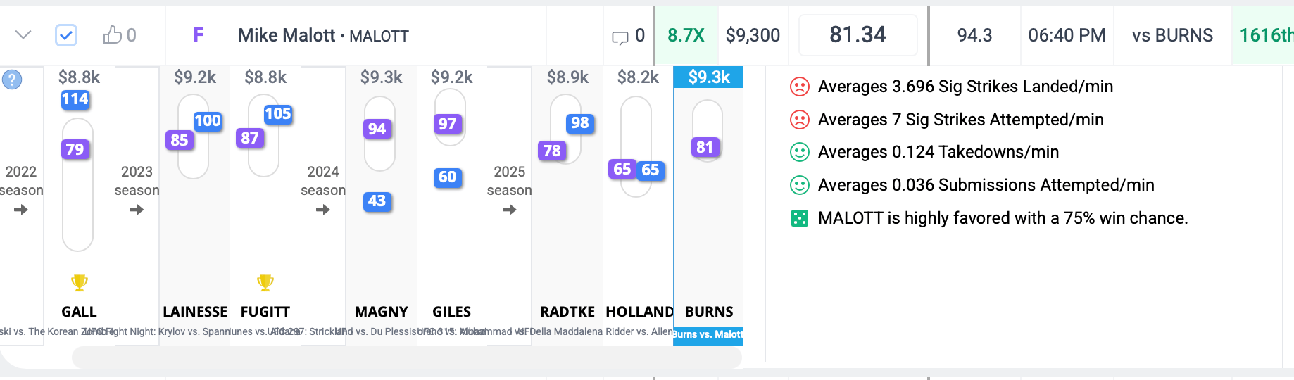 Gilbert Burns ($6.9k): Yo, DJ! Hit that Usher āU Got it Bad!ā You got it, you got it bad if youāre sifting through the Clearance Rack crate leading up to Saturday night. Iāll say this about this version of Gil Burns: He can win this fight if he spams takedowns early. Mike Malott will fade. He has never fought for five rounds, and once completely collapsed with a minute left in the fight against Neil Magny. If Burns can make Malott work early, Malott will fade late. It was only two years ago when Burns was a little over a minute away from beating Jack Della Maddalena before he got caught with a late knee. If Burns can duplicate that effort, he can beat Mike Malott. In his prime, Burns would dominate Mike Malott. But Burns is far from his prime nowadays.