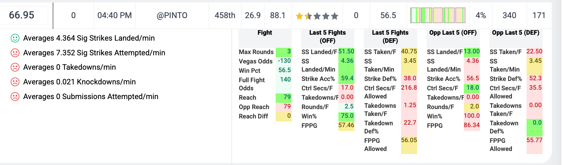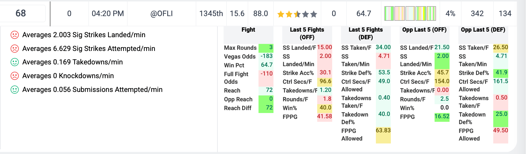 Karolina Kowalkiewicz ($6.8k): This lady is a volunteer firefighter in the pocket. Phonebooth? This lady will fight you in a Port-O-John. Karolina averages five and a half SLpM, and so does her opponent, Julia Polastri. This is a banger women’s scrap. Trust me. These ladies will stand in front of each other and exchange like the last ten seconds of Max vs. Gaethje for the entire fifteen minutes. Against fellow strikers like Polastri, Karolina is almost guaranteed to eclipse the one-hundred-strikes mark, win or lose. She fought two grapplers in her two most recent fights, but before that, she landed one hundred forty-one and one hundred thirty-noine strikes back-to-back. This is a good Fantasy matchup to target.