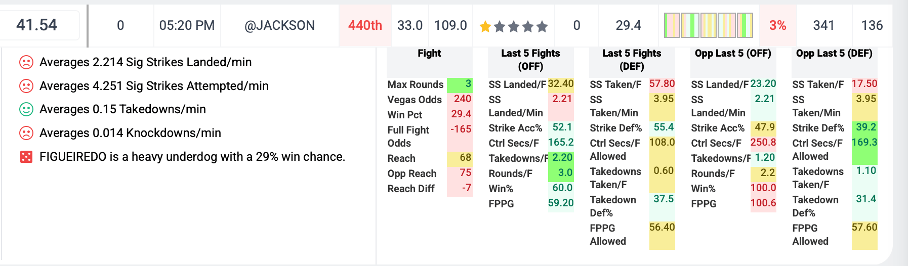 On his feet, Jackson is all speed everything. His boxing is sharp and technical, but his speed is the star of the show. His hands have that 5G speed. You can download his hands in under a blink. And his hands are straight like they’re dry-pressed. You won’t find a single wrinkle in his punches. But Jackson lacks elite-level footwork and head movement. He’s straight up and down, straitjacket. His advantage against Figgy will be on the mat, taking advantage of Figgy’s fifty-eight percent takedown defense and controlling the top position. Output-wise, Jackson averages just under three and a half SLpM, just like his takedown average; they’re identical.