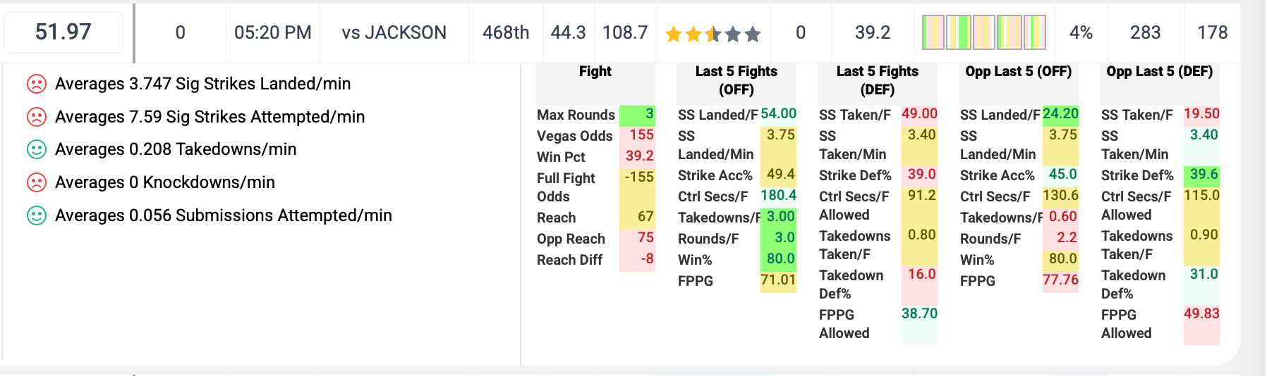 Raoni Barcelos ($7.6k): Barcelos wonât light up the scoreboard, but he is dependable and consistent. You can count on Raoni fighting for a full fifteen minutes. He has only been finished once in the UFC, and that came against Umar Nurmagomedov. Also, Raoni averages nearly five SLpM and two takedowns per fifteen minutes. Heâs a two-pronged Fantasy scorer. With multiple all-or-nothing options on the Value Menu this week, Raoni represents a more conservative option, someone you can count on to put up at least moderate Fantasy points. And he might fook around and win this fight. Barcelos could be the one to control the top position. His takedown defense is better (87%) than Montel Jor-ackson's (67%).