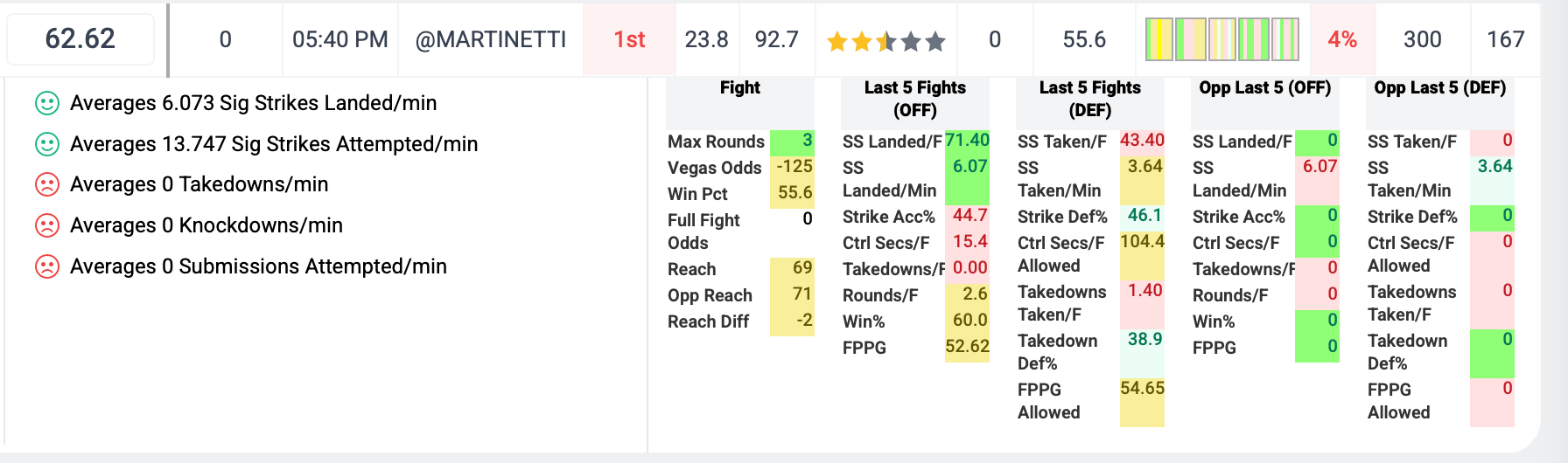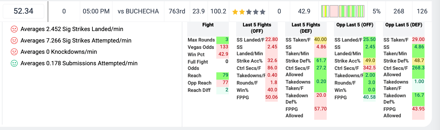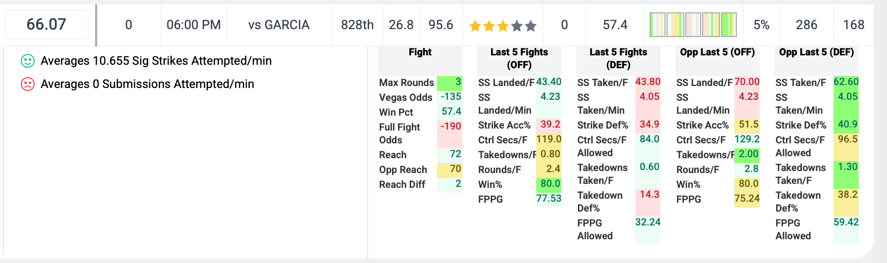 Fantasy-wise, these guys average exactly 4.31 SLpM. Exactly. The difference is that Rafa averages three takedowns per fifteen minutes compared to Hernandezâs one. And both defend around 75%. On paper, this fight is almost dead even. Odds-wise, Hernandez is the (-165) favorite, and Rafa is the (+140) live-ish dog. Rafa is just a little undersized for Hernandez. Rafa can win this fight, but only if he can secure some minutes on the mat. A fifteen-minute kickboxing match heavily favors Hernandez. I like playing this one to go the distance. Itâs been four years since Hernandez was finished, and Rafa has only been finished once in twenty-two career scraps. This might be the first time Iâve picked Hernandez in years. Alexander Hernandez via decision. Put it on wax.