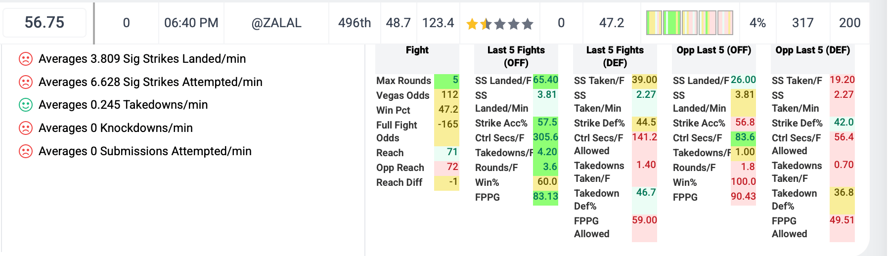 Aljamain Sterling ($7.8k): Itâs never pretty, an Aljo fight. But check it: Aljo has scored well over one hundred fantasy points in four of his last five bouts. Aljo can light up the Fantasy scoreboard with takedowns and control time. Against Calvin Kattar, Aljo only landed thirty-noine significant strikes but racked up 114 fantasy points in a three-round bout. Aljo will get Zalal to the mat. The question is whether he can hold him there and continue to land takedowns deep into the fight. Zalal will slow down in the championship rounds; Aljo wonât. Zala will have to get an early lead and try to ride it to the finish line. I expect Aljo to make a late run. Plus, this fight is almost guaranteed to go the distance, which gives Aljo plenty of time to put points on the board.