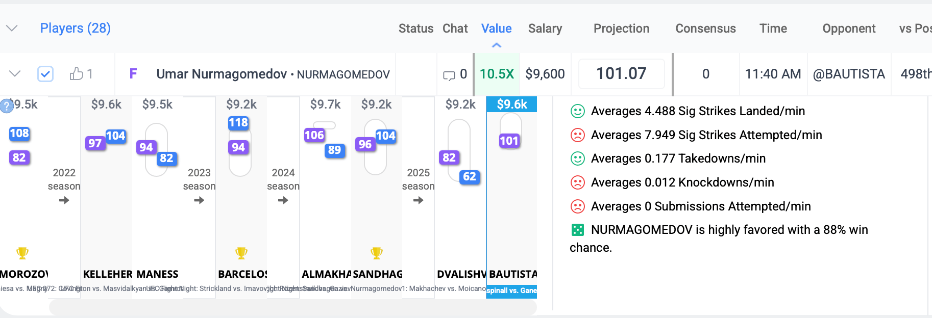 Mario Bautista ($6.6k): You rarely find a fighter this good at the bottom of the Clearance Rack. Bautista averages over eighty Fantasy points per fight. He combines the perfect mixture of stand-up and groundwork. He can compete anywhere the fight goes or anywhere that his opponent’s weaknesses dictate. I see a lot of clinch work in his fight against Umar. Please don’t sleep on the clinch; it’s a sneaky way to rack up significant strikes. Mario will chip away within close quarters and extendcombinations if he can create the space. In a straight kickboxing match, Bautista and Umar would be a toss-up. For this price range, Bautista might be able to at least put some points on the board in a losing effort. But Super Mario ain’t planning on losing. I think he will be more competitive than expected.