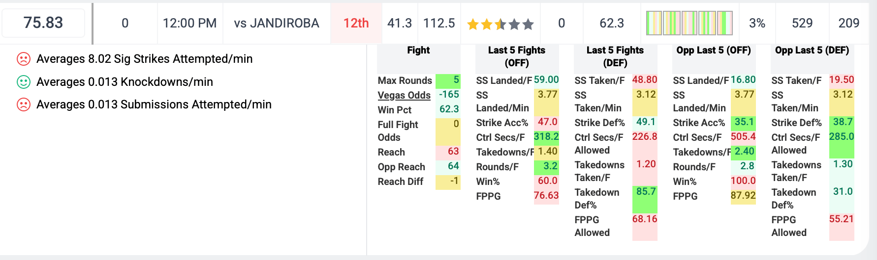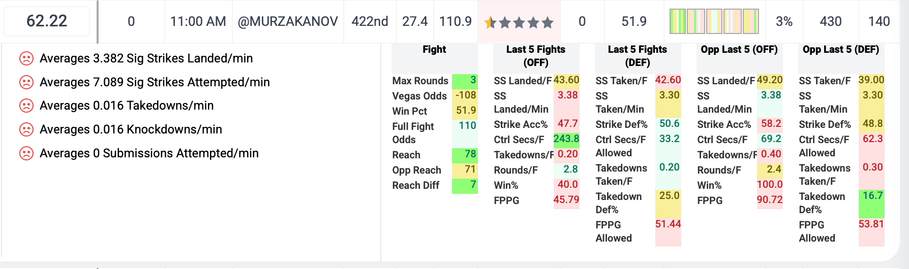 Mateusz Rebecki ($7.8k): You might remember Mateusz Rebecki from his fight of the year candidate against Chris Duncan just a few weeks ago. Rebecki took home the official L, but there were no real losers in that scrap. Rebecki is a world-beater on his feet and on the mat. He will be matched up against the nifty kickboxer Ludovit Klein. Although Klein is a kickboxer, he likes to wrestle away some of the clock, averaging one and a half takedowns per fifteen minutes. The red flag on Rebecki is his fifty percent takedown defense. Rebecki averages three and a half takedowns, but Ludovit defends at a much better rate, rocking a seventy-five percent takedown defense. If Rebecki can keep the fight standing, this will turn into a firefight. Rebecki is coming in off his best statistical performance, landing noinety-two strikes in a losing effort against Duncan.