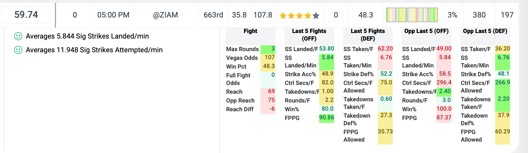 Nazim Sadykhov ($7.9k): When it comes to striking, Lilā Nazim X Sadykhov is slicker than Meekās ass at a freak-off. This guy has more features than a Swiss Army knife. The Slip Nā Rip Records representative combines nifty footwork with a boxerās footwork. He even has a cute little Philly Shell shoulder roll that he uses inside the pocket to not concede ground when under attack. In five UFC bouts, Lil Nazim X averages noinety Fantasy points and is coming in off a career-best one hundred twenty-one-point performance. The keys for Nazim against the undercover sleeper, Fares Ziam, will be staying on his feet and using his movement to get inside of Ziamās long reach. Ziam averages over one and a half takedowns per fifteen minutes, while Nazim defends at seventy-five percent. If Sadykhov can keep this standing, I like his chances of hanging up high significant strikes, even in a loss.