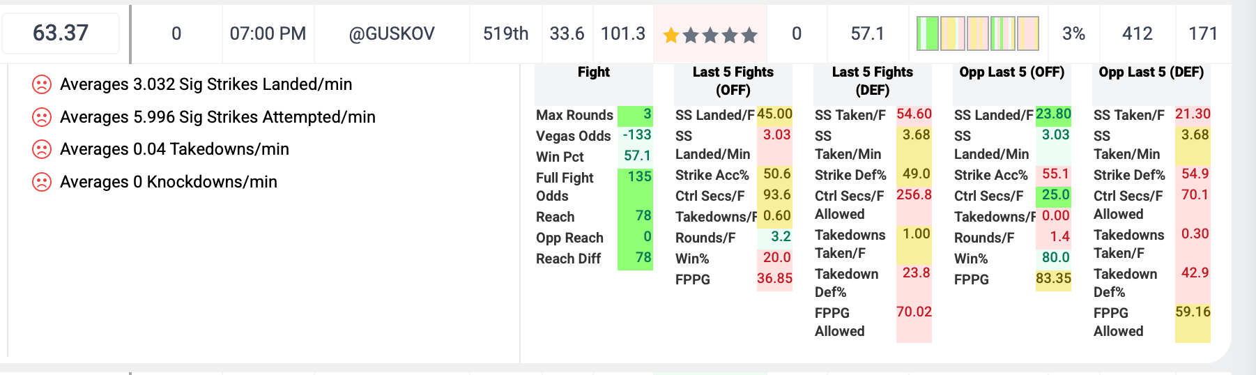 Jan will be the (-140) favorite, and Guskov will be the (+115) live-ass dog. If he can stay upright, he can instigate a firefight that will favor his wild combination striking. Jan doesnāt want that smoke. If he canāt get Guskov to the mat, he wants to chip away with low kicks from the outside while mixing in some short blitzes. Guskov has the power to KO anyone in the division. The only play for Guskov is a TKO/KO. The play for Jan is a decision. I see him taking the safe route and riding out the top position. Guskov will be an all-or-nothing Fantasy pick with a huge upside and a steep downside. I think Jan will play this one smart and avoid a firefight at all costs. Jan Blachowicz via decision. Wax on, wax off.