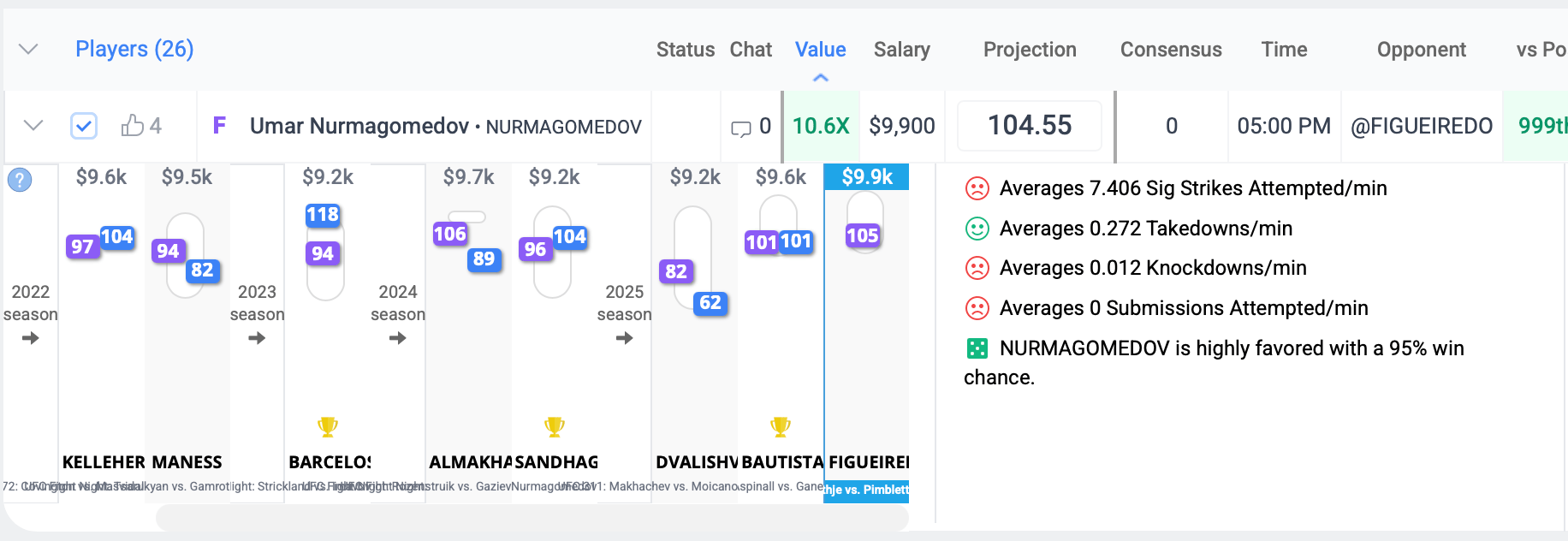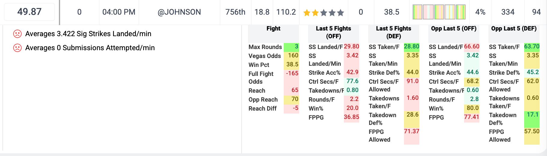 Alex Perez ($7.5k): Not even Josh Allen chokes more than Alex Perez. Alex Perez wakes up, yawns, then falls into a guillotine choke, getting out of bed every morning. So why the fook is he on the Value Menu? Because heâs fighting Charles Johnson, a man with zero UFC submissions. Alexandre Pantoja, Muhammad Mokaev, Tatsuro Taira, and Asu Almabayev: those are Perezâs last four losses. Thatâs a Murderers Row that puts Babe Ruth and them to shame. When Alex dictates where the fight takes place, he is a tough out. Not only is Perez a strong wrestler, but he is also an underrated boxer. He gave Tatsuro Taira major problems on their feet. The biggest hole in Charles Johnsonâs game is his takedown defense (sixty-six percent) and ground game. Alex has the striking ability not be desperate for takedowns. And that will make it easier to land takedowns. Fantasy-wise, Alex averages over four SLpM and over two takedowns per fifteen minutes: not too shabby.