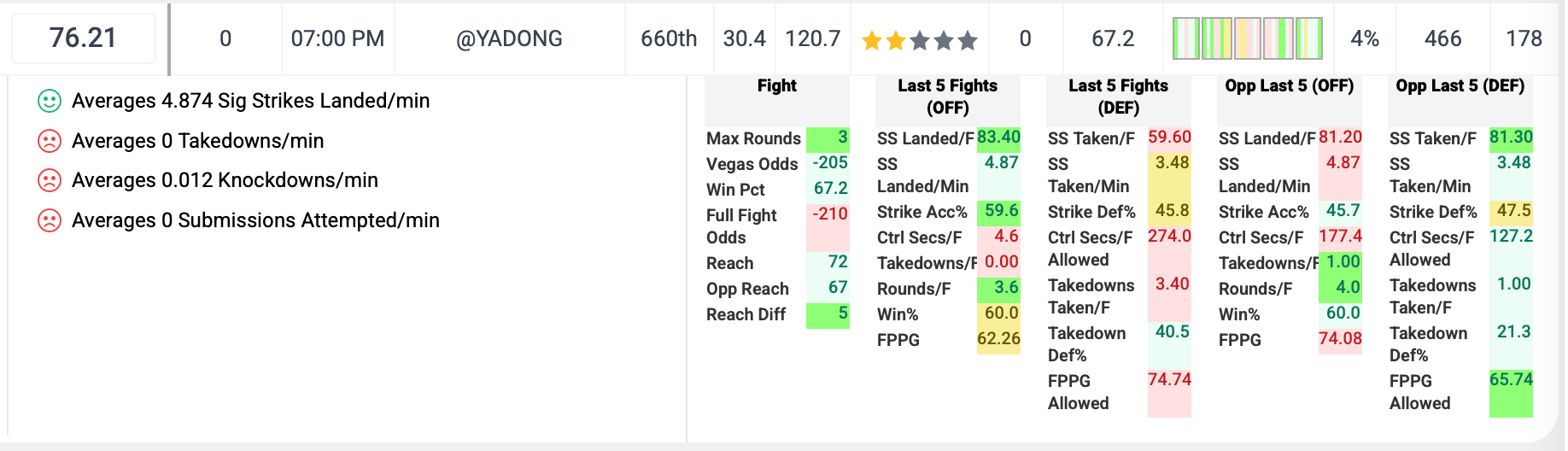 The numbers: This is another high-output Fantasy matchup. OâMalley averages nearly six and a half SLPM compared to Yadongâs over four and a half. Yadong will have to take more risks to make up for the gap. OâMalley is the (-210) favorite, and Yadong is the (+175) live-ass dog. Yadong has gone 6-2 since 2021. The two losses were against Cory Sandhagen and the new Champ, Petr Yan. The question is, where is OâMalleyâs head after losing two fights in a row? That will fook with a fighter mentally. Yadong has to pressure him early and put some doubt in OâMalleyâs head. The play for this one is a decision. These guys are technically sound with physical attributes that counteract each other. I donât feel great about this one, but give me Danksy. Sean OâMalley via decision. On wax.