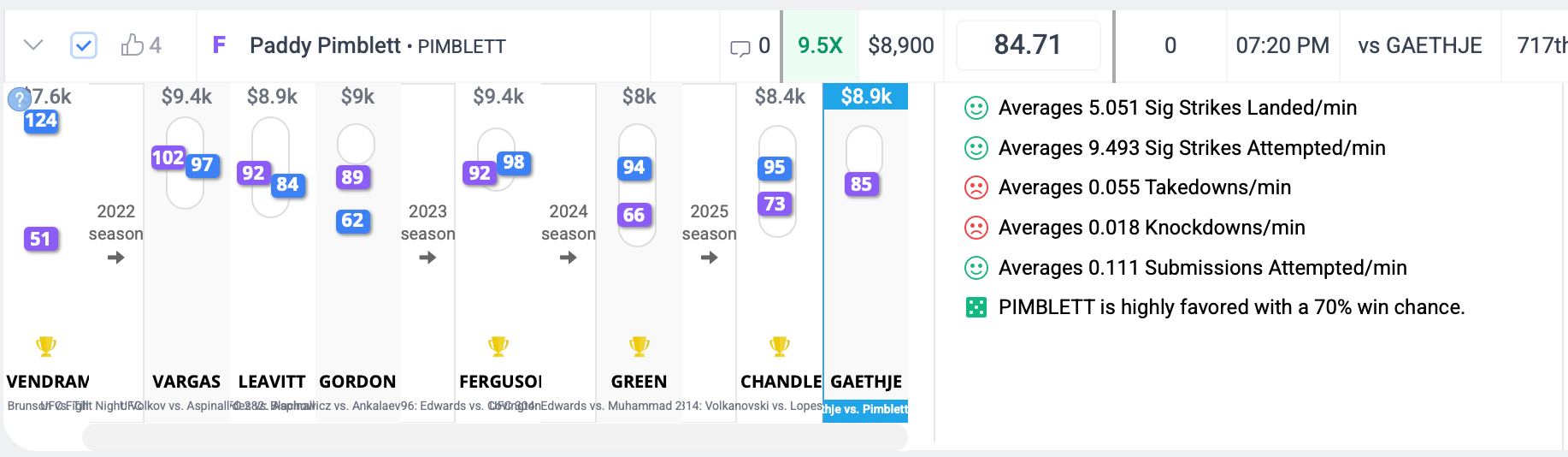 Justin Gaethje ($7.3k): This one is a no-brainer. Gaethjeâs upside is impossible to pass up. He is a far better striker than Paddy. Paddy is far from an Islam Makhachev when it comes to takedowns. If Gaethje can keep the fight standing, he will pick Paddy apart with a good chance of scoring a finish. But Gaethje is a huge gamble. The few times we have seen him on his back, he looked completely lost. He melted against Khabib and Charles as soon as the fight hit the mat. Gaethje is one takedown away from being choked out by Paddy. Paddyâs back mount and full mount are like Alcatraz, inescapable. But Paddy often looks amateurish on his feet, especially defensively.