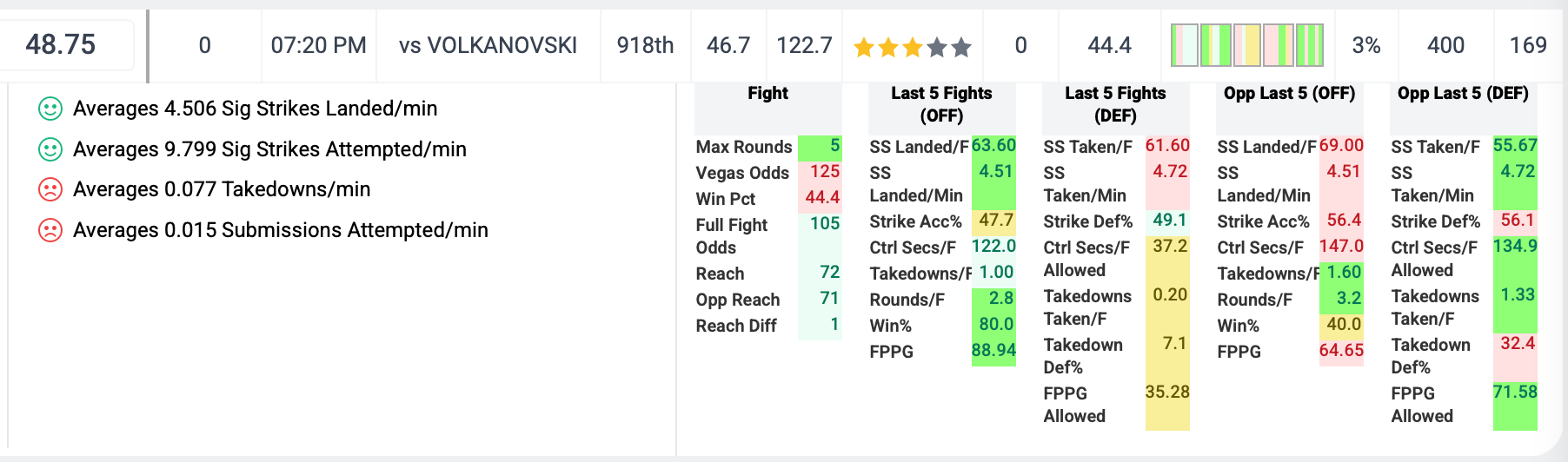 Diego Lopes ($7.7k): In two of his last three fights, Lopes landed well over one hundred significant strikes. Lopes didnāt score any takedowns in the first match against Volkanovski. I think that will change this time around. All he needs is one takedown to finish the fight by submission or TKO. His ground and pound is relentless. One takedown could lead to an avalanche of significant strikes, whether he finishes the fight or not. He is the bigger finishing threat. He can submit Volk or finish him on the feet. Go back and watch the last two rounds of the first fight. Lopes finished strong, and Volk limped across the finish line. Jean Silva is a more dangerous striker than Volk, and Lopes jumped right into the fire against Silva. I expect Lopes to get off to a faster start, and I like the chances of Lopes hitting the one-hundred-strike mark.