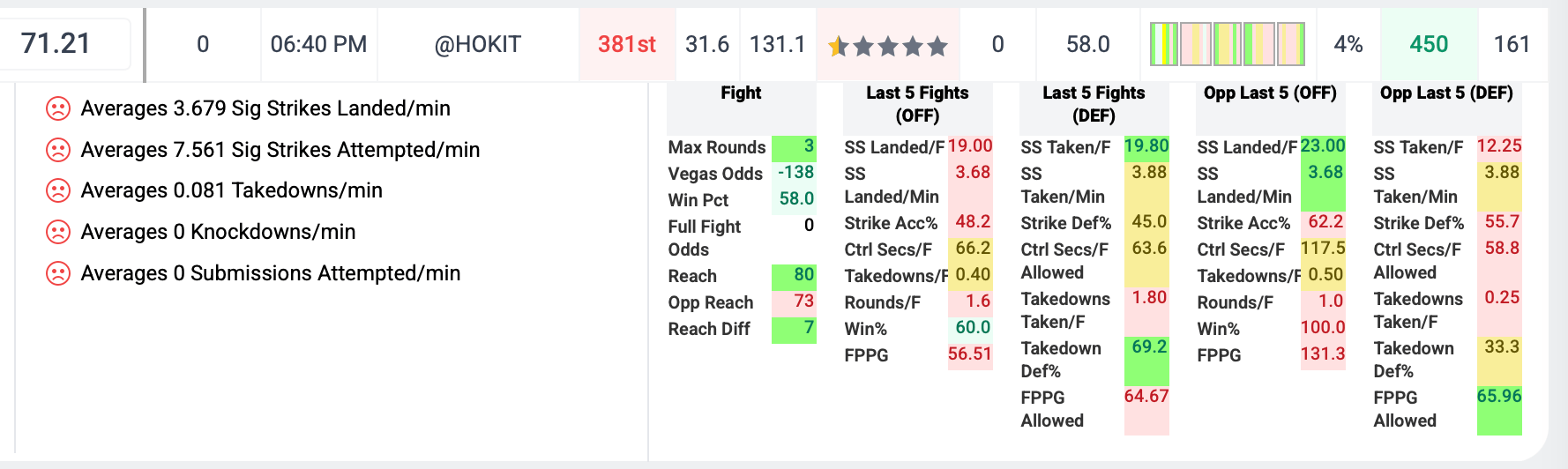 Josh Hokit ($7.8k): This is a risky pick. Hokit will either run over Curtis Blaydes, or he will come out of the gate NBA Jam on fire and fade as the fight progresses. Hokit is in a similar position to Abdul Malik, a couple of weeks ago, when Malik got exposed by a high-level striker with excellent takedown defense. Blaydes has solid wrestling to match Hokit. Against Jailton Almeida, Blaydes was taken down early but got back to his feet each time. On the feet, this is anybodyās fight. Hokit has more power than Blaydes, but Blaydes is a more technical/traditional boxer. Hokitās pace will be the key. He pushes a featherweight-like pace that no heavyweights can match. The question is, how long can he keep that pace?